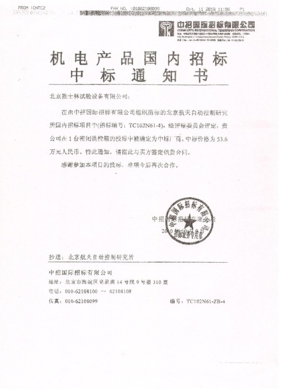 金秋十月,秋高氣爽!由中招國(guó)際招標(biāo)有限公司精心組織,在北京航天自動(dòng)控制研究所2010年國(guó)內(nèi)項(xiàng)目二期招標(biāo)中,北京雅士林試驗(yàn)設(shè)備有限公司憑借強(qiáng)大的綜合實(shí)力,以各項(xiàng)排名指標(biāo)均名列前茅的優(yōu)異成績(jī)成功中標(biāo)密閉溫控箱(招標(biāo)編號(hào):TC102N61-4)項(xiàng)目工程。中標(biāo)金額為53.6萬(wàn)元人民幣。 北京航天自動(dòng)控制研究所2010年密閉溫控箱工程項(xiàng)目是該所2010年的重點(diǎn)項(xiàng)目。該項(xiàng)目的成功中標(biāo)進(jìn)一步確立了北京雅士林環(huán)境試驗(yàn)設(shè)備在航天市場(chǎng)的領(lǐng)先地位,也為北京雅士林的的持續(xù)發(fā)展樹(shù)立了堅(jiān)實(shí)的信心。在環(huán)境試驗(yàn)設(shè)備市場(chǎng)競(jìng)爭(zhēng)空前激烈的情況下,北京雅士林以有效的資源投入、專(zhuān)注的研發(fā)、前瞻的設(shè)計(jì)理念、嚴(yán)謹(jǐn)科學(xué)的生產(chǎn)管理制度、及時(shí)高效專(zhuān)業(yè)的工程服務(wù)隊(duì)伍換來(lái)了在技術(shù)、產(chǎn)品、市場(chǎng)各方面的良好口碑,并取得了優(yōu)異的市場(chǎng)成績(jī)。