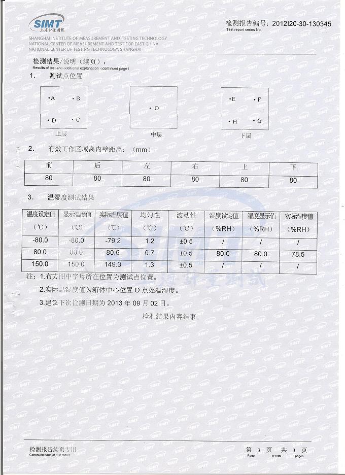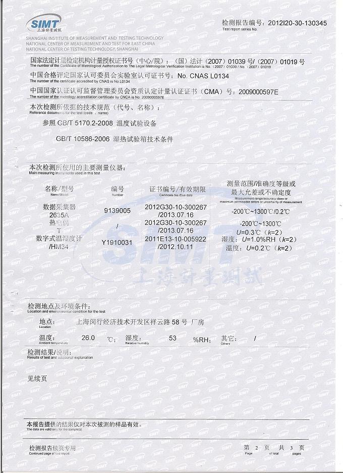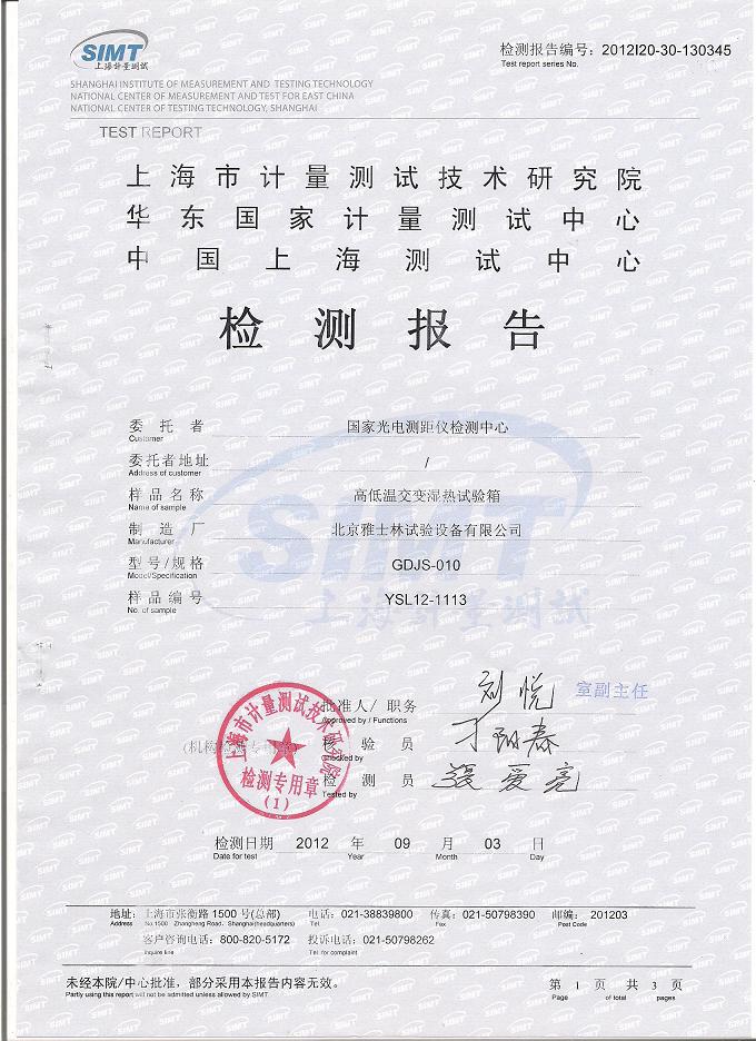 >>高低溫交變濕熱試驗(yàn)箱檢測報告-上海計量院-國家光電檢測