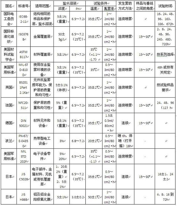 鹽霧試驗箱各國標準試驗方法對照表如下: