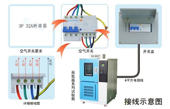 高低溫試驗箱的電源要求是AC380V±10%  50±0.5Hz  三相五線制,并要求用戶在安裝現(xiàn)場為設(shè)備配置相應(yīng)容量的空氣或動力開關(guān),并且此開關(guān)必須是獨立供本設(shè)備使用(建議電源開關(guān)容量:32A),其具體接線方式如下: