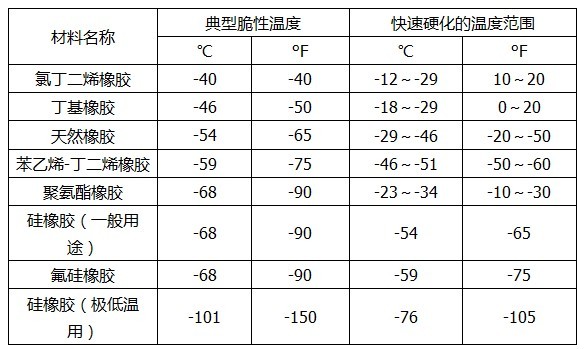 通常對材料規(guī)定一個低溫使用范圍,如下表: